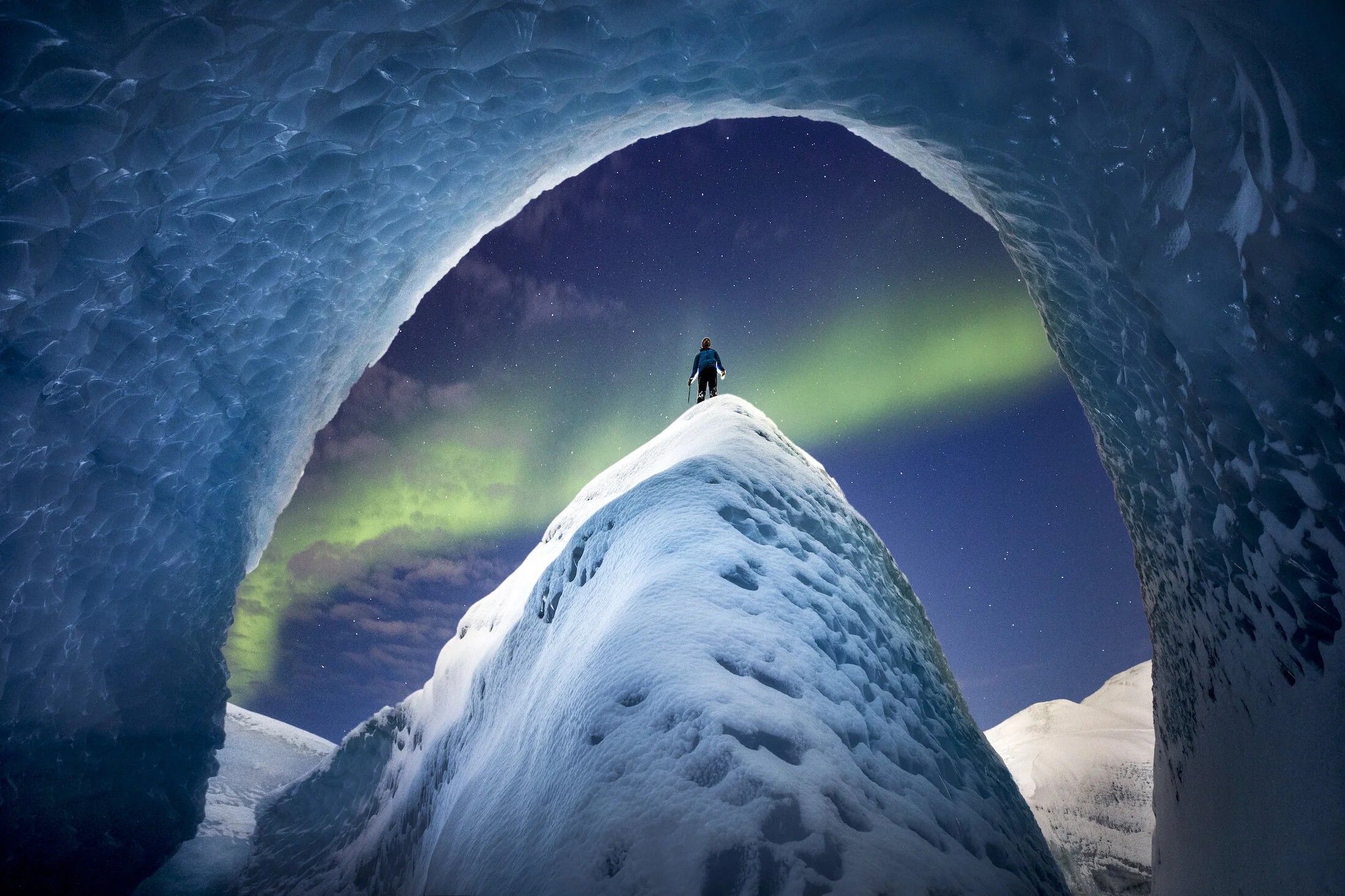 I frantically ran around, crampons on, to re-create the four compositions I had scouted, and was able to frame the aurora borealis in all four. I've always felt I've had more than my share of luck with the aurora over the years. But that night was something else. This particular image was shot from the middle of a bend at the bottom of an ice canyon. The cold may have meant our blue lakes were gone, but it had enabled us to travel along the bottom of such canyons, thus opening up incredible compositions. I set up the tripod, went with settings of f/2.8, ISO 1600 and 10 seconds, manually focus on the rim of the canyon (where I would be standing), got the 5DIV to shoot continuously and then proceeded up the canyon, to a less steep section nearby and then up to the rim for the self-portrait. I placed my Lupine headlamp on the ground behind me to cast a bit of rim light on myself. I took about eight similar images and selected this one because it's the one where the aurora looked best.