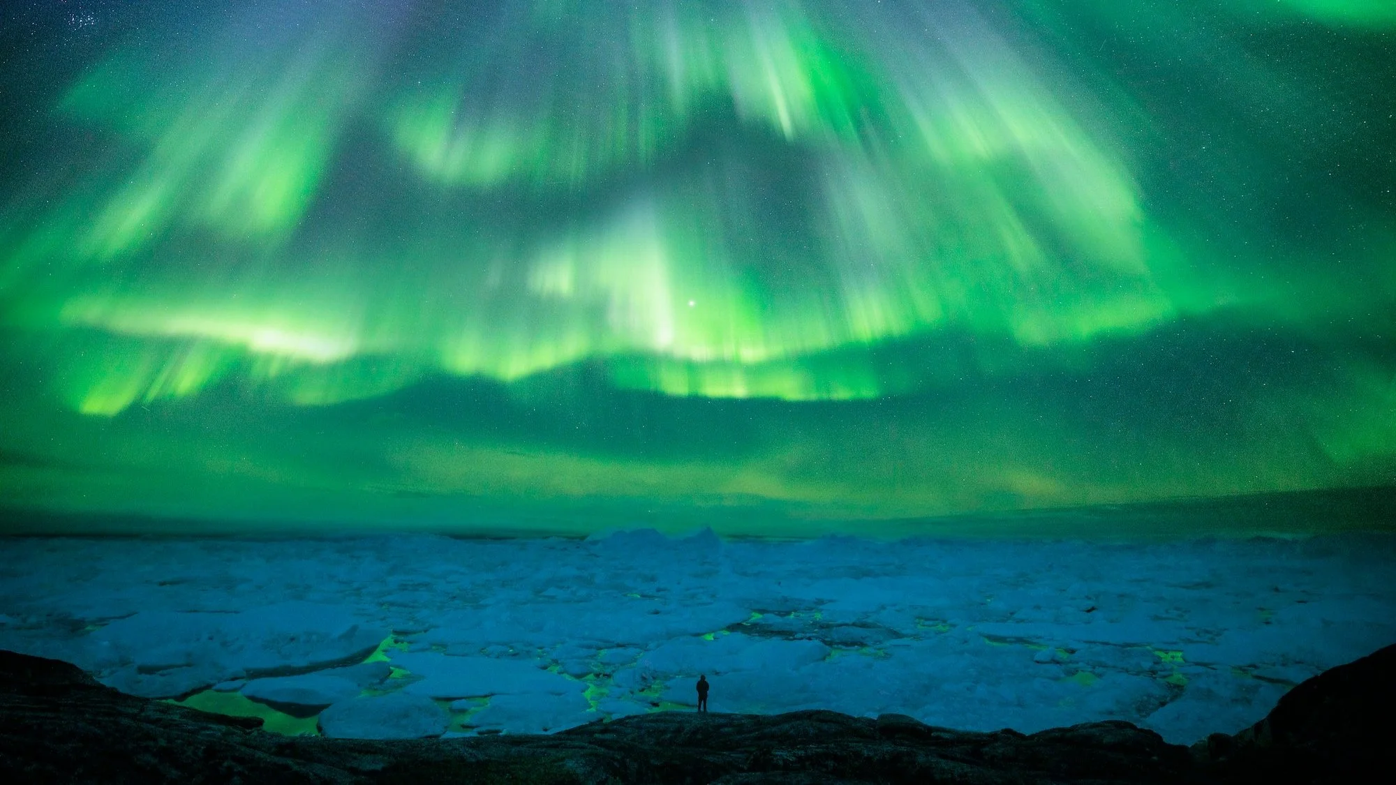 Aurora and ice on the Greenland ice sheet. Photo by Paul Zizka Photography.