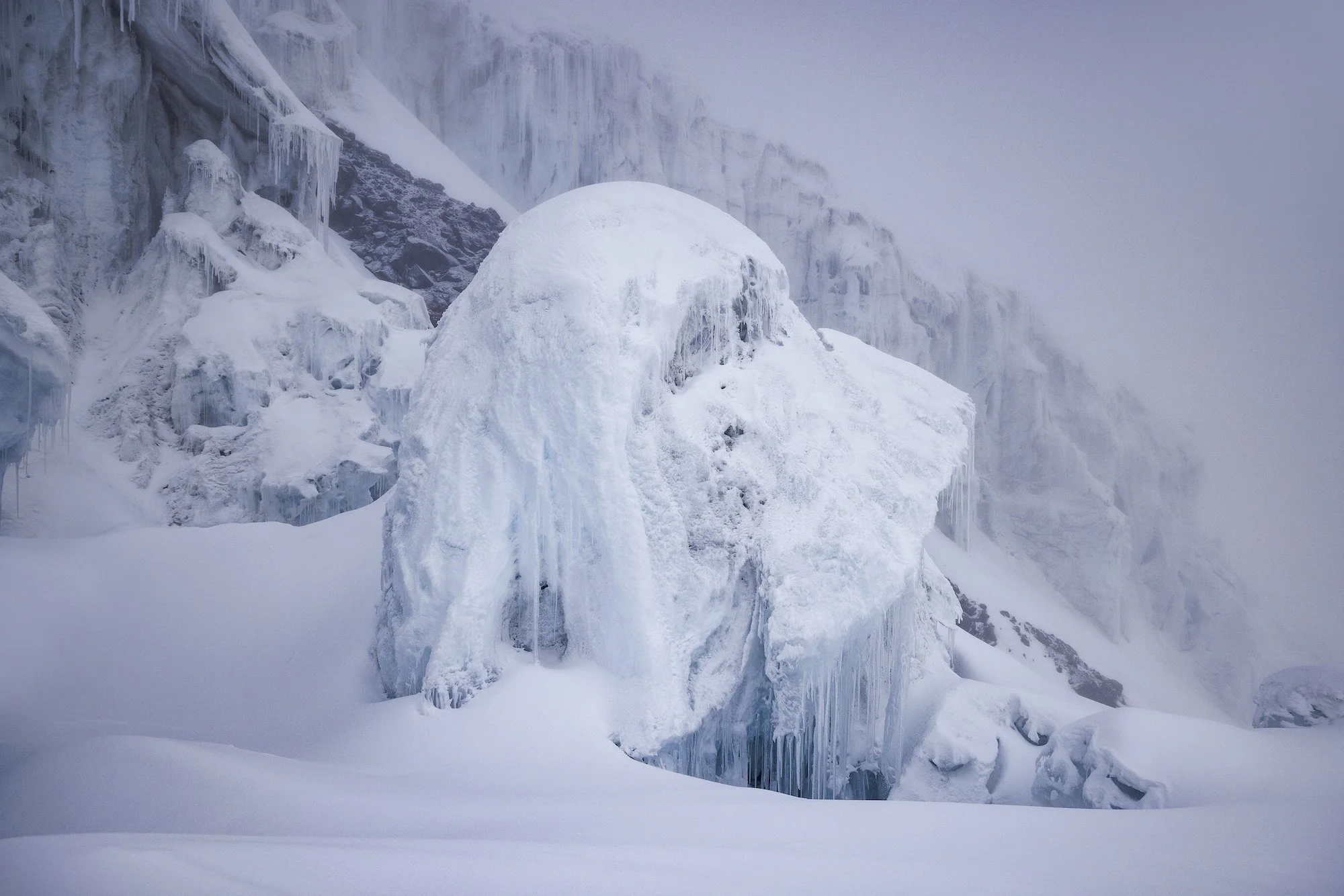 Despite the blizzard that set in shortly after setting up camp, we made good use of the next 48 hours by locating stunning ice caves and canyons within a kilometre of our tents. By the time the clear night came around, I had 4 or 5 shots I was after. I had a plan and a vision. Nightfall came cloudy, however, and we started getting concerned that our astrophotography plans would fall through. At midnight, we were still fighting the cloud cover despite all forecasts still calling for crystal clear conditions (I had re-checked with the InReach). Behind the veil, one could tell that the aurora was dancing. It was one of those situations where the images still looked great on the back of the cameras (due to the ice features being so photogenic), but every time we'd meet in the dark, one of us would say "Oh man, can you imagine if the clouds weren't there?!" Eventually, Stephen and Curtis decided to make their way back to camp and would shoot there if the skies cleared up. I opted to stick it out a little longer. After all, sunlight wouldn't come for another five hours and I had come all this way. Finally, at around 1 a.m., the cloud cover started dissipating quickly, revealing a bright ribbon of green.